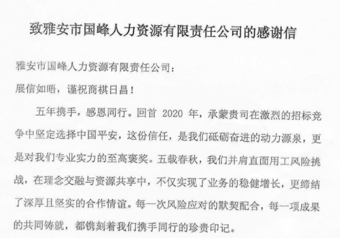 國峰公司喜獲平安財(cái)產(chǎn)雅安中支感謝信